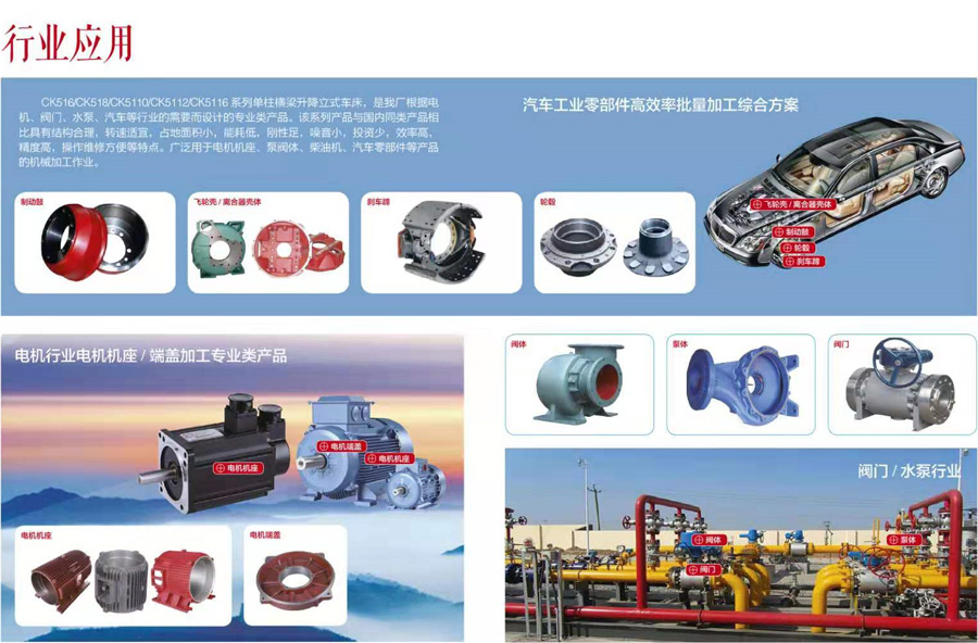 CK516/CK518/CK5110/CK5112/CK5116系列單柱橫梁升降立式車床,是我廠根據(jù)電機(jī)、閥門、水泵、汽車等行業(yè)的需要而設(shè)計(jì)的專業(yè)類產(chǎn)品。該系列產(chǎn)品具有結(jié)構(gòu)合理,轉(zhuǎn)速適宜,占地面積小,能耗低,剛性足,噪音小,投資少,效率高,精度高,操作維修方便等特點(diǎn)。廣泛用于電機(jī)機(jī)座、泵閥體、柴油機(jī)、汽車零部件等產(chǎn)品的機(jī)械加工作業(yè)。